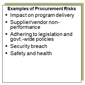 Risks addressed by the procurement function in government agencies include: the impact on program delivery (if the products or services required to support program delivery are not available); supplier/ vendor non-performance; adhering to legislation and government-wide policies and rules; breach of security; safety and health; and project cost overruns and delays, to name a few.